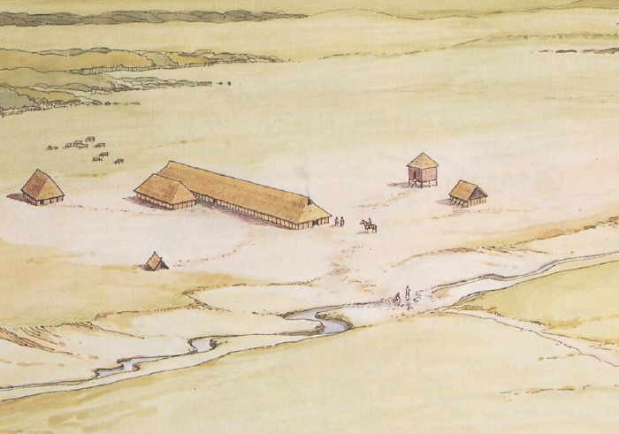 Der Kern eines germanischen Gehöftes, das in der Regel aus mehreren Bauten verschiedener Art bestand, war das große Langhaus. Menschen und Tiere