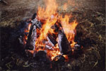 zunächst mit hoher und heller Flamme. Nach einer Stunde brannte das Feuer nur noch mit kleiner gleichmäßiger Flamme; die oberen Scheite waren verkohlt und der Kegel zu einem flachen Haufen zusammengesunken. Es