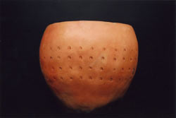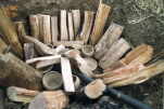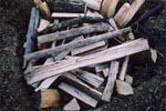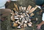 das lederhart getrocknete Brenngut zusammen mit gut abgelagerten Holzscheiten eingeschichtet. Holzscheite zwischen den einzelnen Gefäßen verhinderten, daß Scherben platzender Gefäße umherflogen und benachbarte