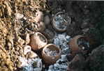beständig vor sich hin. Eine Stunde später war das Holz soweit niedergebrannt, daß die ersten Gefäße sichtbar wurden. Schließlich lagen, viereinhalb Stunden nachdem der Meiler angesteckt worden war, die noch