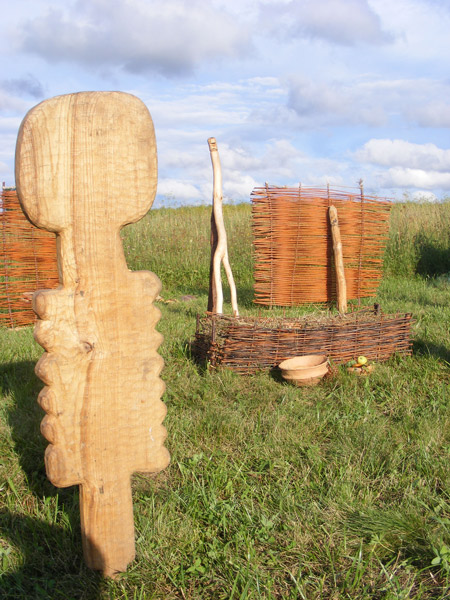 Häufig in Form von mit Flechtwerkzäunen umfriedeten Kultbereichen in deren Mitte ein ebenfalls mit Flechtwerk umfriedeter Altar aus Rasensoden stand. Gottheiten wurden in Form von Stangen-, Pfahl-, Astgabel-, Kantholz- und Brettidolen, die einen abgesetzten Kopf tragen, verehrt. Es fanden sich dort neben diversen Tier- und Sachopfern auch Reste von einigen wenigen Menschenopfern.